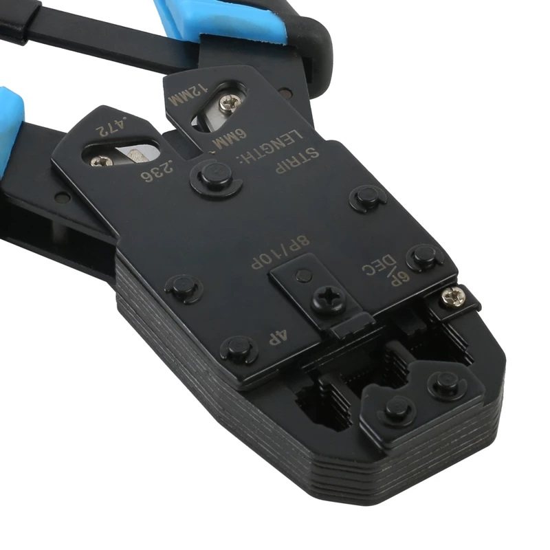 • درگاه سمت راست جهت پرس سوکت های نوع ۴P4C و ۴P2C (کابل های ارتباط گوشی به دستگاه تلفن) علاوه بر امکان پرس، قابلیت های زیر نیز در این ابزار گنجانده شده تا استفاده کننده با تنها یک ابزار ۳ کاره کلیه نیازهای پردازش سیم و کابل شبکه خود را برآورده سازد. لخت کردن سیم و کابل های شبکه با روکش PVC از قطر ۶ الی ۱۲ میلیمتر (۰.۲۳۶ الی ۰.۴۷۲ اینچ)